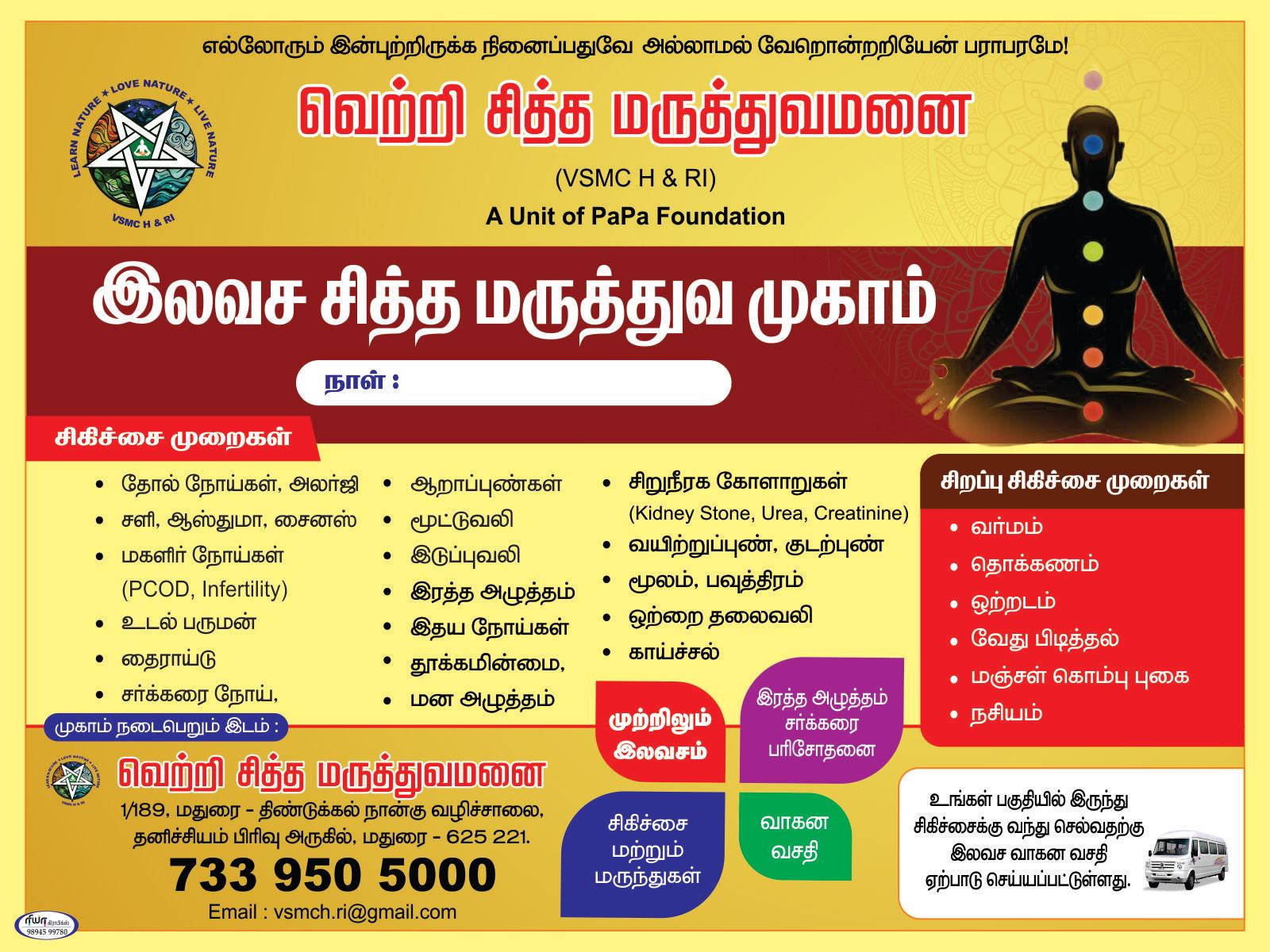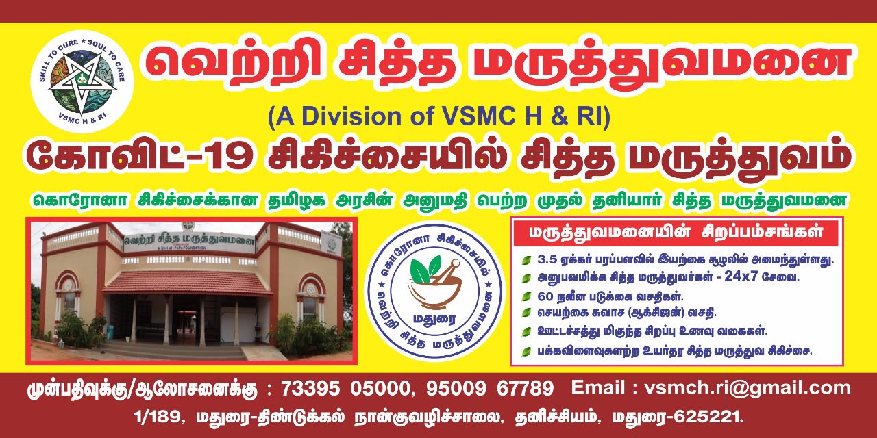 Our VSH is the 1st government registered and approved siddha hospital to treat Covid-19 patients. We have treated around 350 covid19 OP and IP patients. we treated not only covid 19 symptoms and also treats post covid complication like diabetic neuropathy, body pain, migraine, bronchial asthma etc.