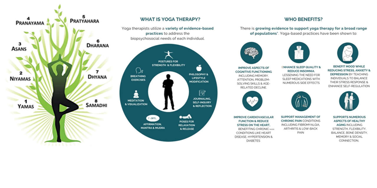 Yoga therapy is the process of empowering individuals to progress toward improved health and well being through the informed application of the teachings and practises of yoga.